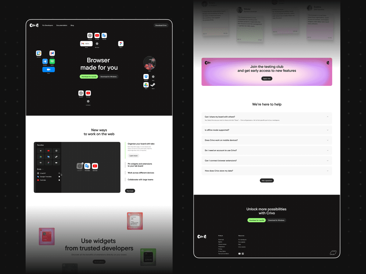Crivo — это первый в мире браузер на основе досок, позволяющий пользователям свободно размещать вкладки, виджеты и ярлыки в одном пространстве. Он помогает более эффективно организовать рабочее пространство и поддерживает общие доски, позволяя командам сотрудничать и превращать просмотр веб-страниц в многопользовательский процесс.